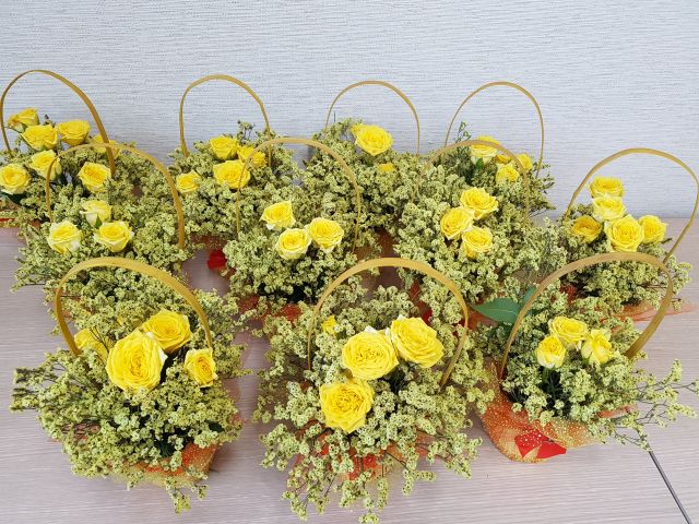 노란장미와 시네신스를 이용해 꽃바구니 만들기를 했습니다.