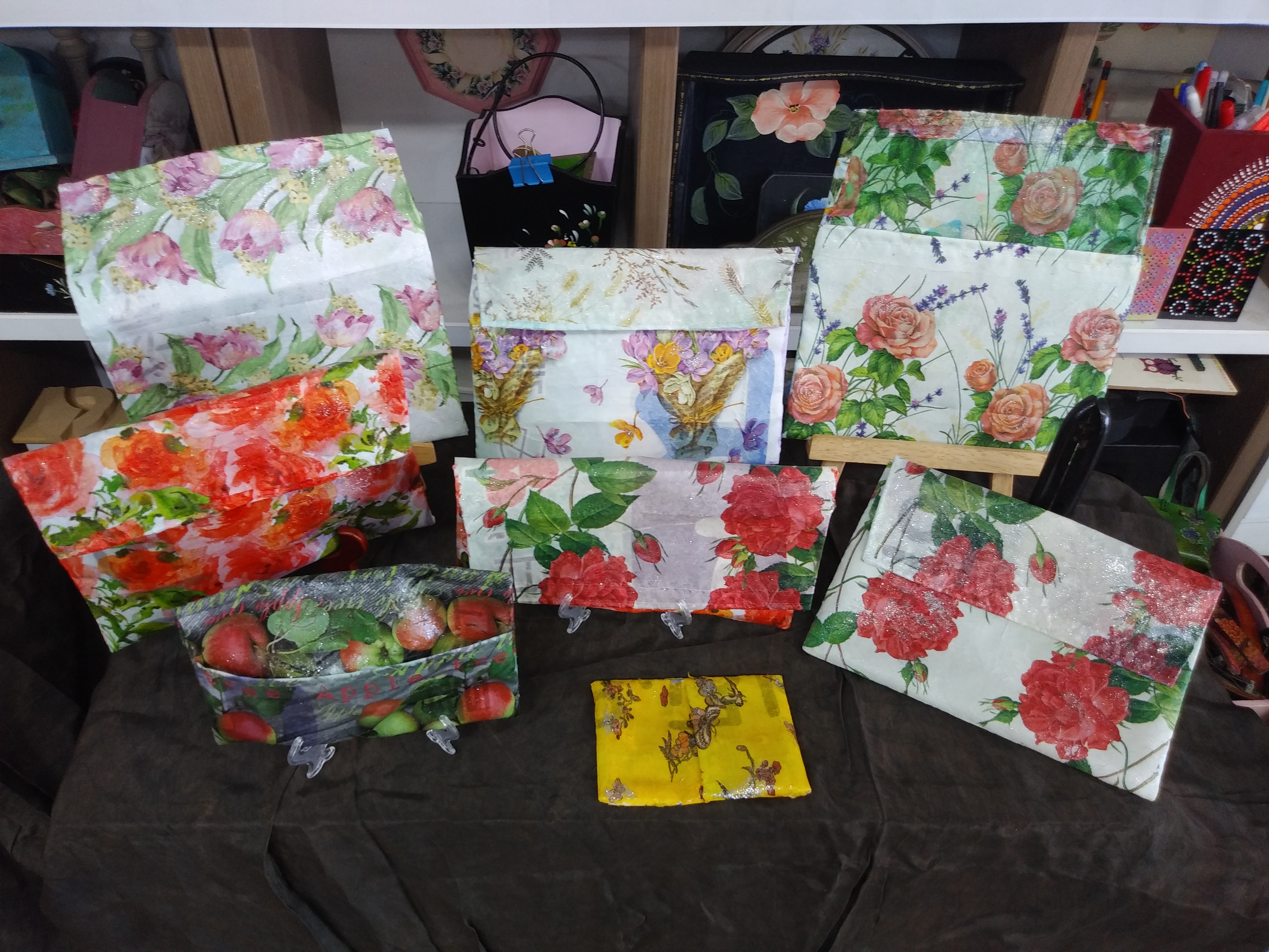 각자가 원하는 냅킨을 선택하여 현수막 파우치에 붙이고, 드라이로 건조하고