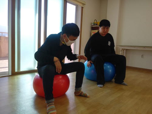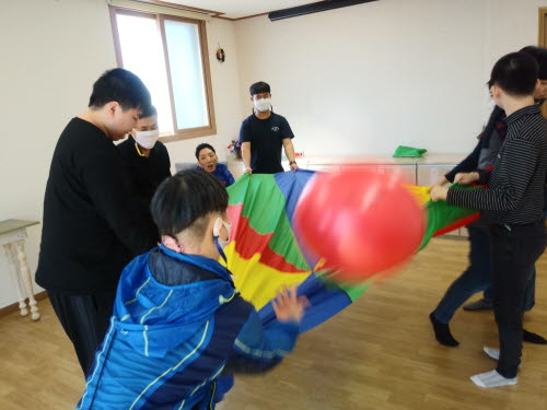 파라슈트 위에 짐볼을 넣고 바닥에 떨어지지 않게 띄우기, 짐볼 위에 앉아 균형잡기, 짐볼에 등을 기대어 누워 균협잡기 등 다양한 활동을 하였습니다.