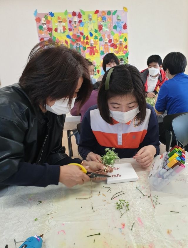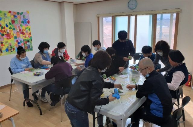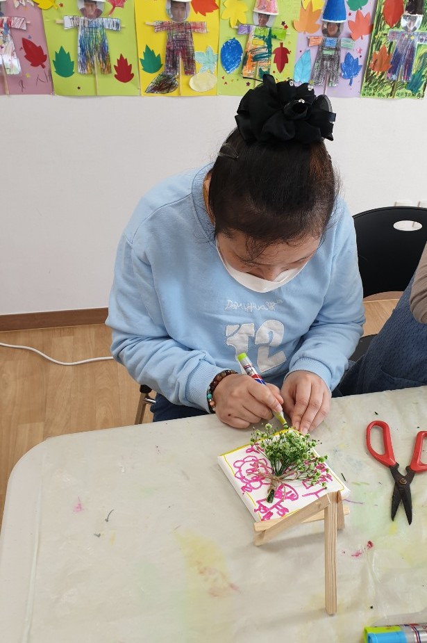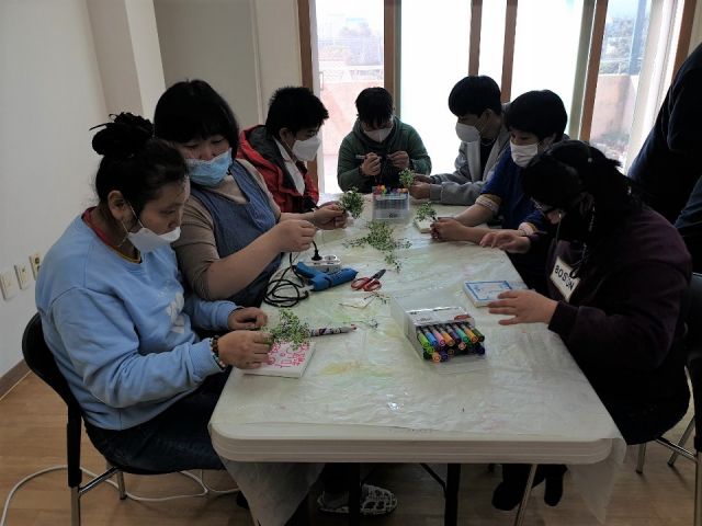 초록색으로 염색한 안개꽃으로 나무를 만들어 꾸미는 활동입니다.