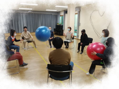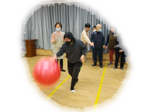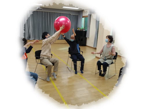 심리운동1으로 의자에 앉아 머리 위로 볼 옮기기, 볼을 발로 차기,