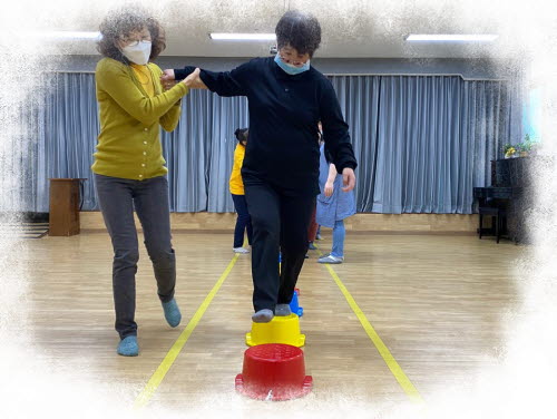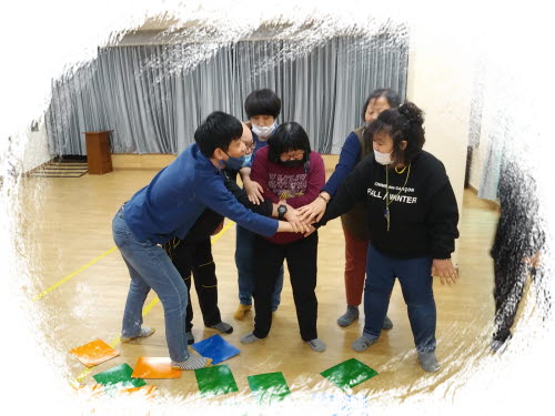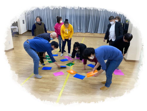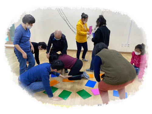 심리운동1으로 노랑, 분홍, 초록, 파랑색 색깔판 뒤집기 활동으로