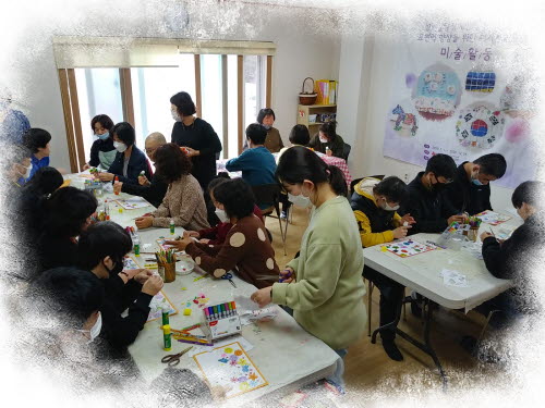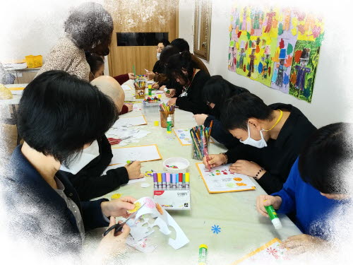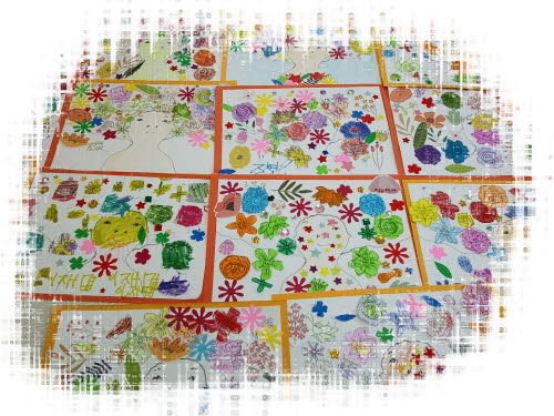미술활동으로 장미, 국화 등 다양한 꽃들을 채색하고 오려 붙이며