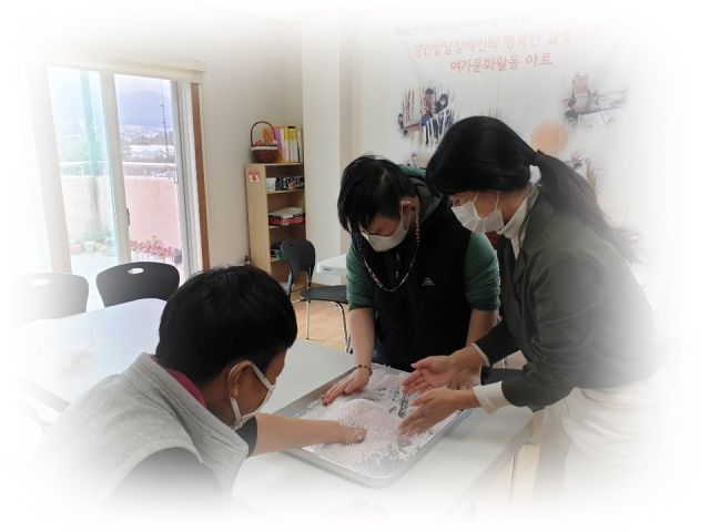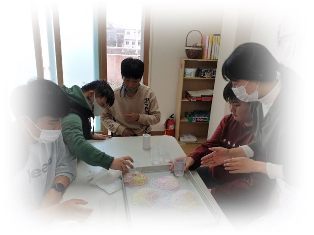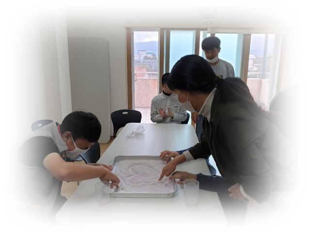 쟁반에 소금을 넓게 펼쳐 손으로 자유롭게 표현해보았습니다.
