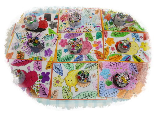 미술활동으로 달팽이를 채색하고 신문지로 자기가 살고 싶은 크기로...