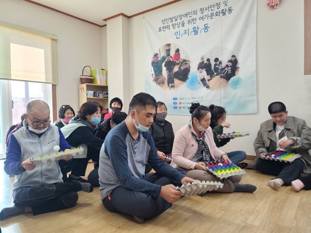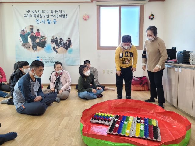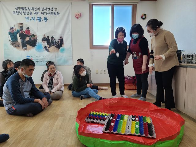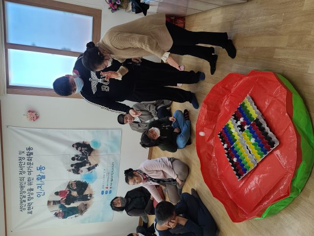 색깔계란판을 이용한 활동을 하였습니다. 활동 시작 전 스트레칭도 진행하고 있습니다.