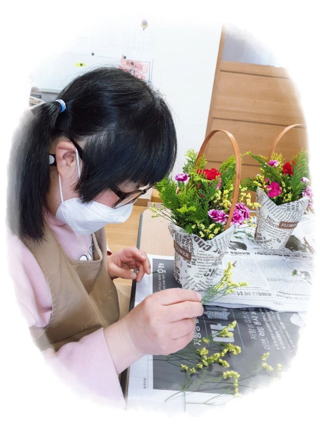 카네이션, 측백, 안개꽃 등을 이용해서 어버이날 카네이션 만들기 활동을 했답니다.
