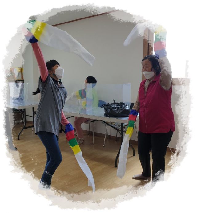 교사의 시범을 보며 한삼놀이 활동 했습니다