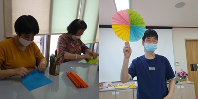 여가활동으로 다양한 색깔의 종이로 부채를 만들어 보고, 부채를 부치며 소원을 빌어보았습니다.