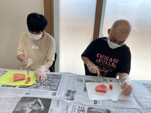 금일 1반 체험활동으로 수박화채를 잘라보고 직접 재료를 넣어본 후 이용인들과 함께 맛있게 먹는 시간을 가졌습니다.