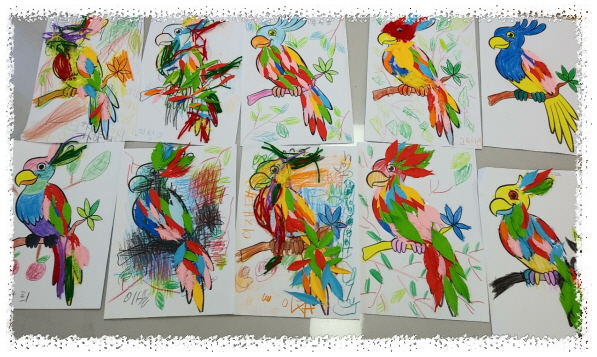 털실과 색지로 깃털을 오려 붙이고 앵무새 주변을 나무잎과 열매를 그리기도 하였습니다.