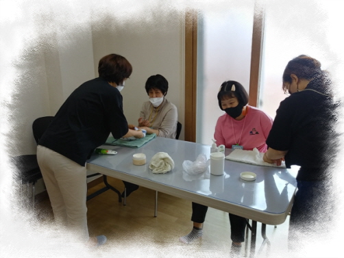 피부미용기초로 선생님들과 서로 인사를 나누고 손맛사지는 어떻게 하는지 등에 배우고 체험하는 시간을 가졌습니다.