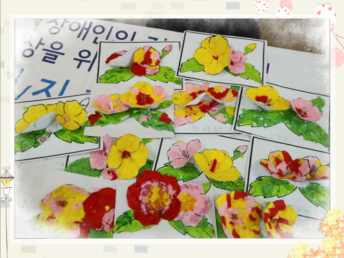 다양한 색의 한지를 찢어 무궁화 꽃을 꾸몄습니다.