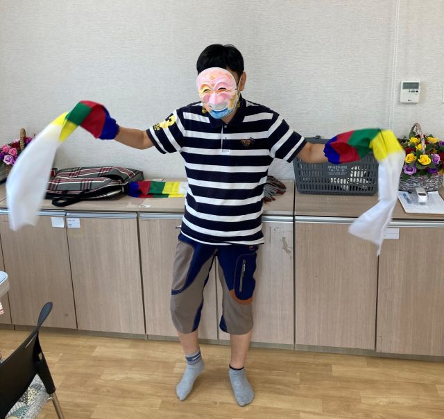 금일 여가활동 시간에는 봉산 탈 사자춤 동화구연을 감상하였습니다. 이용인분들이 색연필을 이용하여 탈을 아름답게 꾸며 한삼을 끼고 각시탈, 하회탈, 양반탈 등을 써서 덩기덕쿵덕 리듬에 맞춰 춤을 춰보는 시간을 가졌습니다.