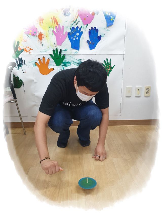 팽이를 곱게 색칠해 뱅글뱅글 돌려보았습니다.