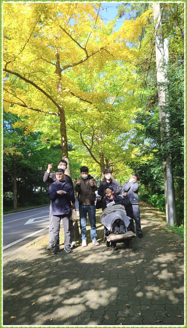 산책로에 떨어진 은행나뭇잎을 줍고 자유롭게 산책하며