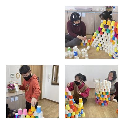 종이컵을 던지거나 발로 툭 건드려 넘어 뜨리게 한 후 박수를 치며 즐거운 시간을 보냈습니다.