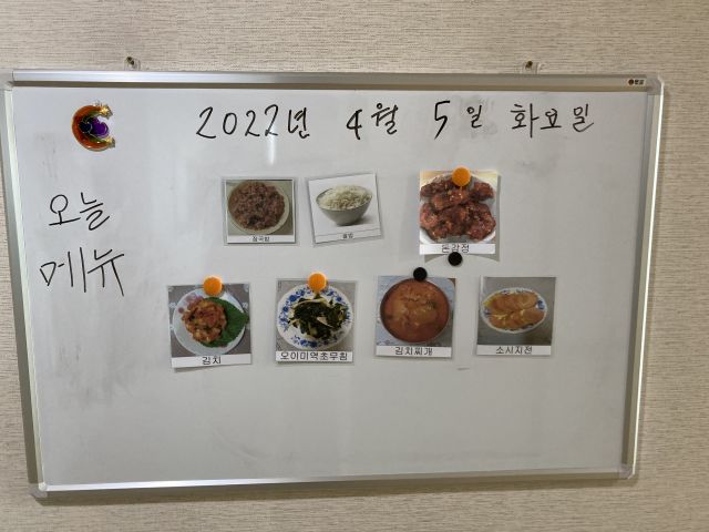 '밥, 김치찌개, 돈강정, 미역초무침, 쏘시지전, 김치'입니다.