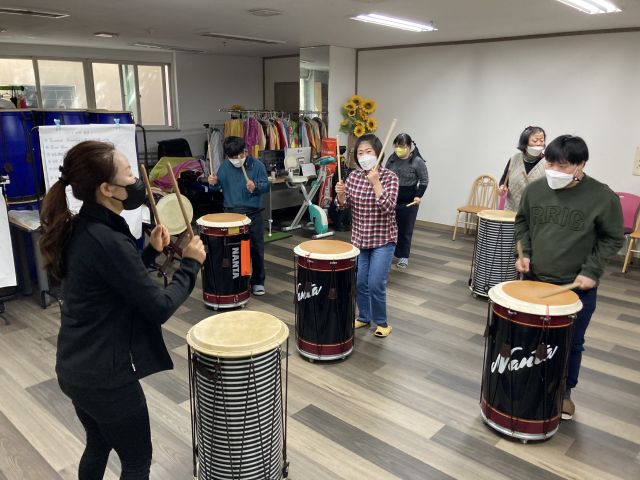 금일은 한잔해, 네박자 등 다양한 트로트 음악에 맞춰 '덩' '덩덩' 덩짝' '덩덩짝짝' 등 다양한 장단으로 난타연주를 해보았습니다.