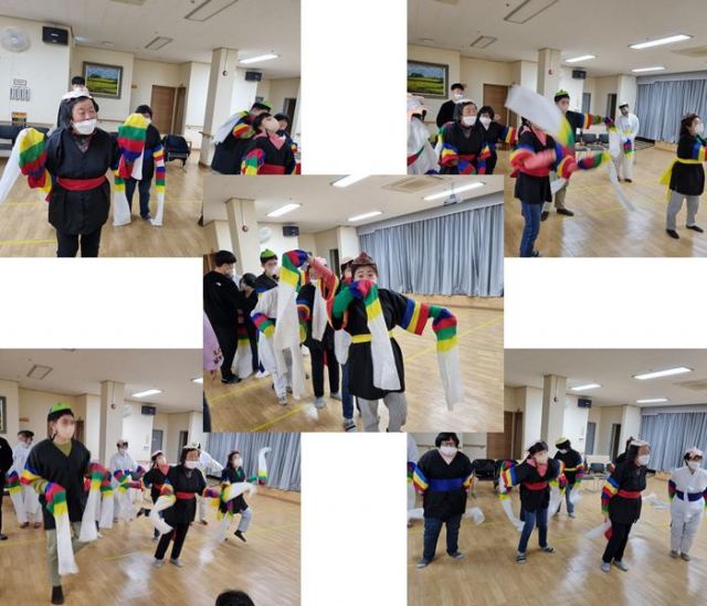 탈춤놀이활동으로 덩덕쿵체조와 뷰티풀코리아, 범내려온다 노래에 맞춰 탈춤추기를 하였습니다.