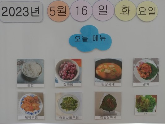 쌀밥, 잡곡밥, 된장찌개, 돈야채볶음. 상추쌈, 깻잎장아찌, 유채나물무침, 김치