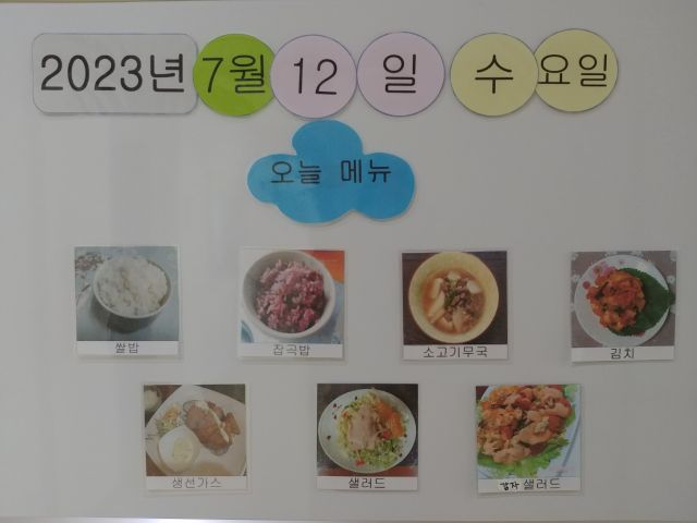 쌀밥, 잡곡밥, 쇠고기무국, 생선가스, 도라지나물, 야채샐러드, 감자샐러드, 김치