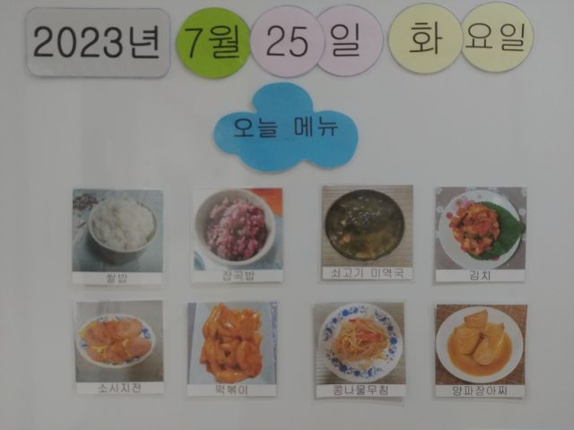 쌀밥, 잡곡밥, 쇠고기미역국, 떡볶이, 소시지전, 콩나물조림, 장아찌, 김치
