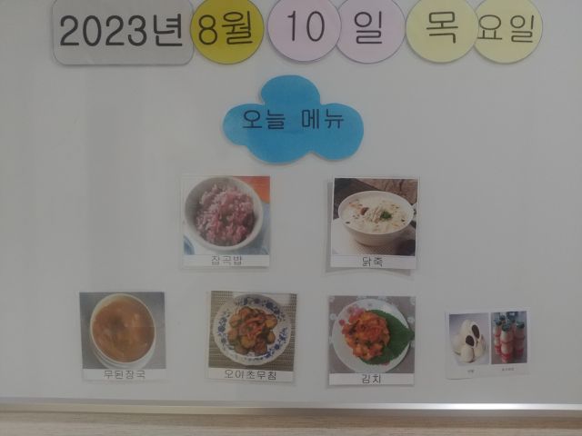 잡곡밥, 닭죽, 무된장국, 오이생채, 김치, 찐빵&요구르트