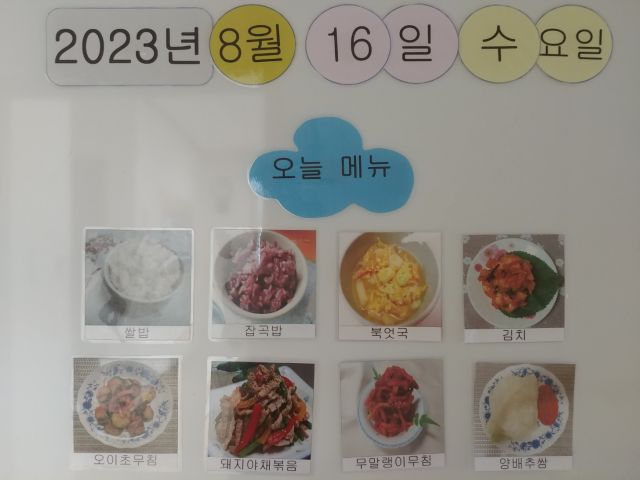 쌀밥, 잡곡밥, 돈야채볶음, 무말랭이무침, 오이냉채, 양배추쌈, 김치