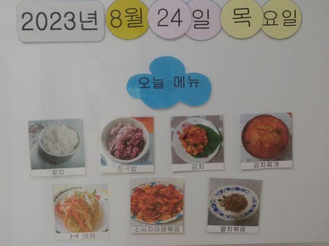 쌀밥, 잡곡밥, 김치찌개, 김치, 쏘시지볶음, 가지나물, 멸치볶음, 콩나물냉채