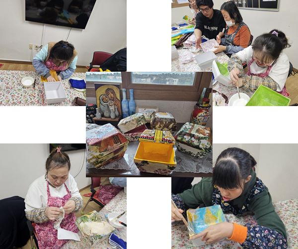 생활공예활동으로 한지와 냅킨을 이용하여 사각함을 만들었습니다.