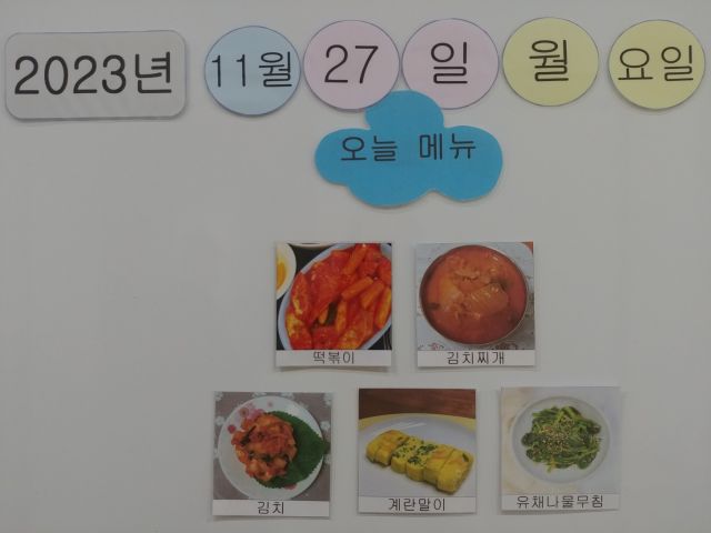 김치찌개, 떡볶이, 계란말이, 유채나물무침, 김치