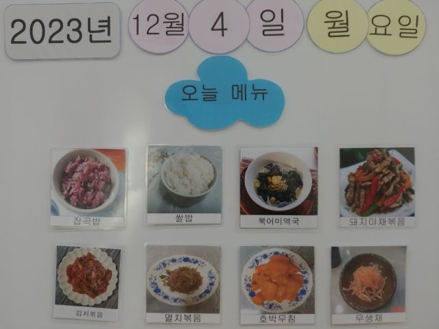 쌀밥, 잡곡밥, 북어미역국, 돈야채볶음, 호박나물, 멸치볶음, 무우생채, 김치볶음
