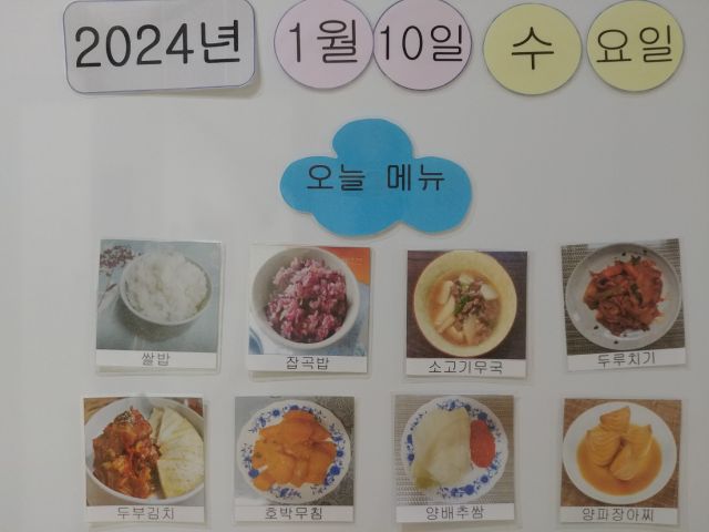 쌀밥, 잡곡밥, 쇠고기무국, 두부김치, 돈두루치기, 호박나물, 양배추쌈, 장아찌