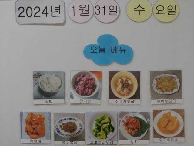 쌀밥, 잡곡밥, 쇠고기무국, 떡볶이, 호박부침개, 브로컬리두부무침, 멸치고추장볶음, 김치, 장아찌