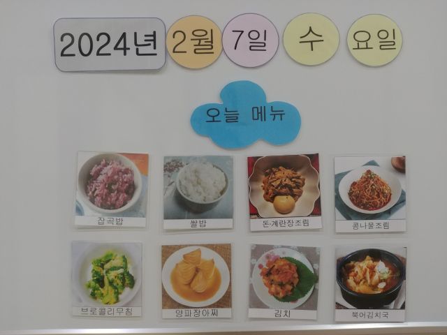 쌀밥, 잡곡밥, 북어김치국, 콩나물조림, 돈계란장조림, 브로커리무침, 장아찌, 김치