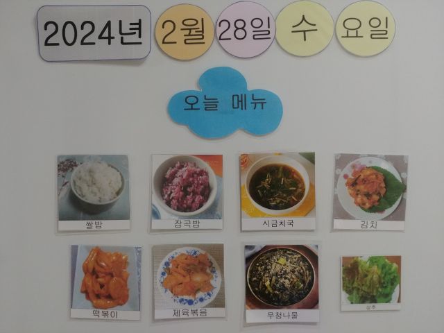 쌀밥, 잡곡밥, 시금치국, 돈야채볶음, 떡볶이, 무청나물, 김치, 상추