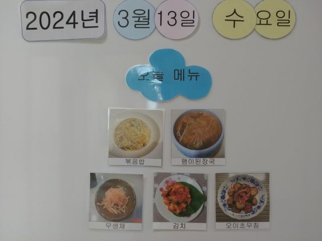 볶음밥, 팽이버섯국, 김치, 오이초무침, 무생채