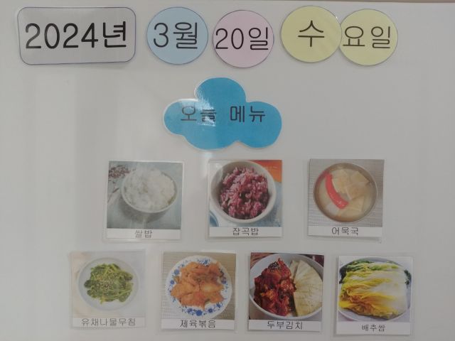 쌀밥, 잡곡밥, 어묵국, 두부, 볶음김치, 돈볶음, 유채나물무침, 배추쌈