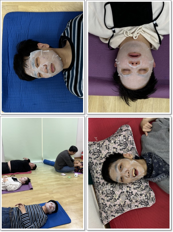 스킨테라피로 얼굴에 로션 도포를 한 뒤 마스크 팩을 하며 명상음악을 감상하였습니다.