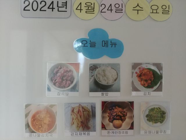 쌀밥, 잡곡밥, 콩나물김칫국, 장조림, 유채나물무침, 감자볶음, 김치