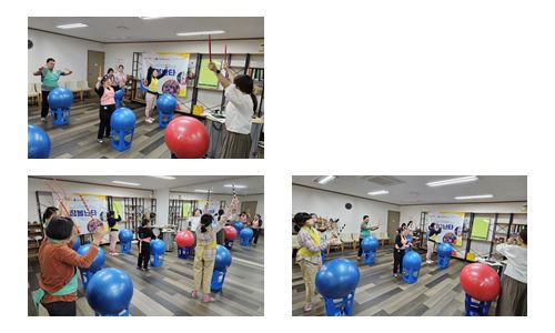 짐볼난타활동으로 아기염소 음악에 맞춰 몸 풀기를 한 후 웃당보민, 찔레꽃, 어부바 음악에 맞춰 장단과 퍼포먼스를 하였습니다.