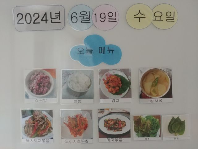 쌀밥, 잡곡밥, 감자계란국, 돈야채볶음, 도라지초무침, 가지볶음, 상추, 깻잎, 김치