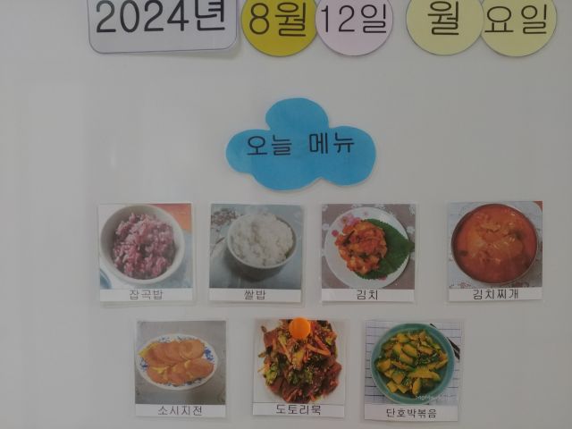 쌀밥, 잡곡밥, 김치찌개, 소시지전, 호박나물, 도토리묵무침, 김치