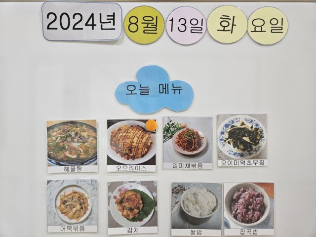 해물탕, 오므라이스, 일미채무침, 오이미역초무침, 어묵볶음, 김치