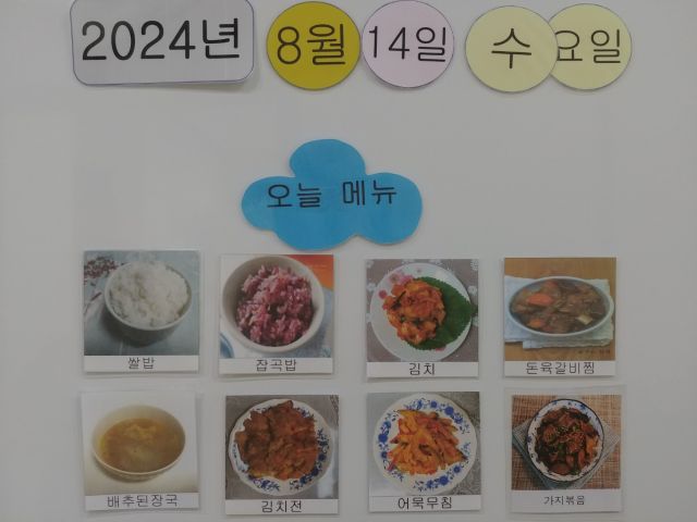 쌀밥, 잡곡밥, 배추된장국, 갈비찜, 가지볶음, 어묵초무침, 김치전, 김치