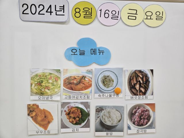 -오이냉국, 고등어김치조림, 숙주나물무침, 버섯장조림, 무우조림, 김치