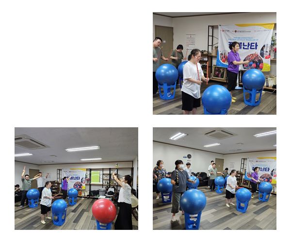 행복놀레 학원에서 편곡한 음악에 맞춰 짐볼난타를 하였습니다.