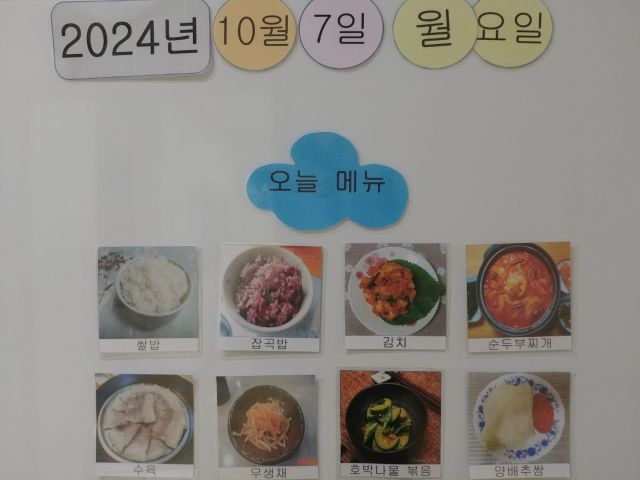 쌀밥, 잡곡밥, 순두부찌게, 수육, 양배추쌈, 호박나물, 무생채, 김치