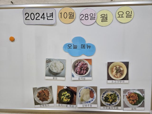 소고기무국, 두루치기, 호박나물볶음. 양배추쌈, 브로콜림무침, 김치
